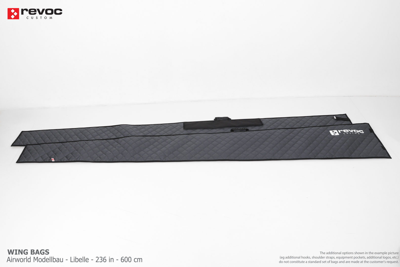 We create custom wing bags especially for you based on your individual order. You can select the colors, add a logo, include the model name on the cover, or choose additional markings and useful options.