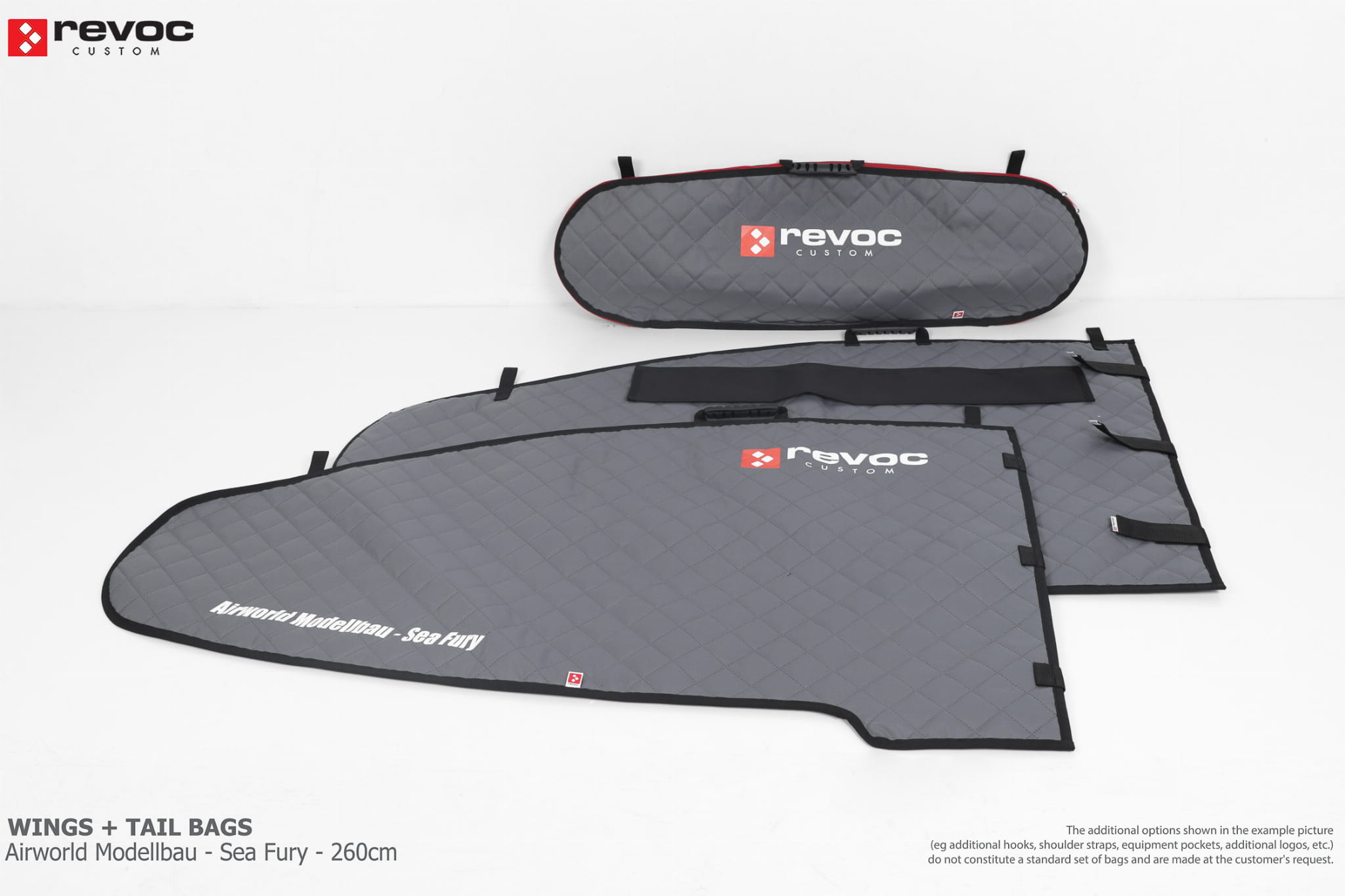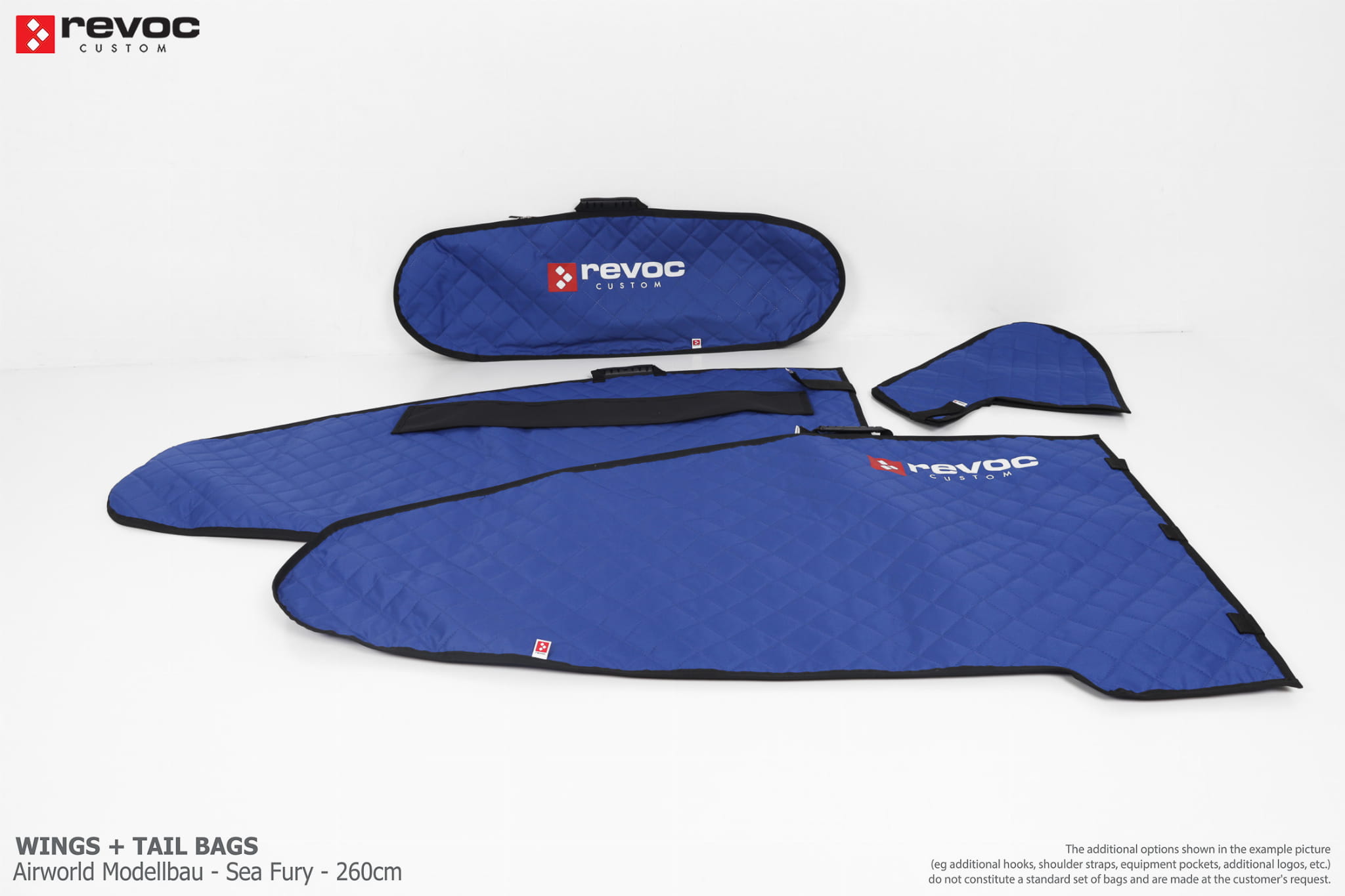 All REVOC RC bags are custom-made specifically for your model. Whether you have a jet, aerobatic aircraft RC, glider, or bi-plane RC model, our wing bags are completely tailored to fit the unique structure of your remote control planes. Each wing bag is crafted according to your individual preferences, parameters, and special requests. Please include any additional comments or wishes in the COMMENT section when placing your order, or email them directly to revoc@revoc.eu for a fully personalized wing bag RC experience.