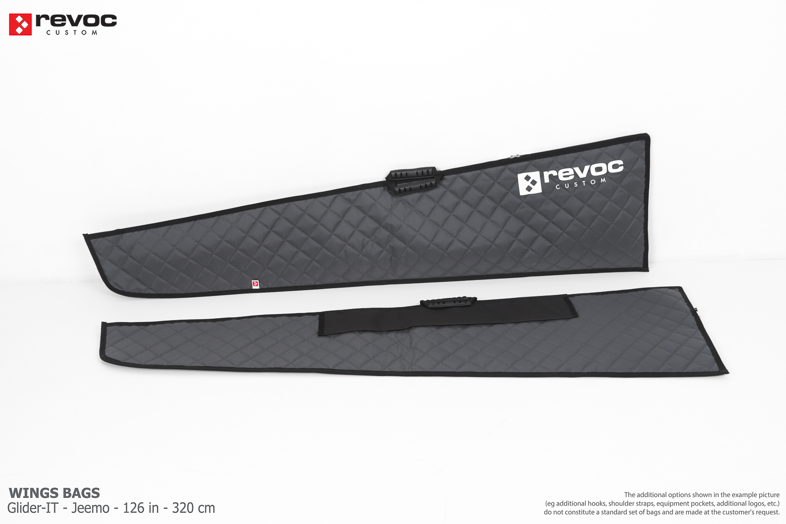 We create custom wing bags especially for you based on your individual order. You can select the colors, add a logo, include the model name on the cover, or choose additional markings and useful options.